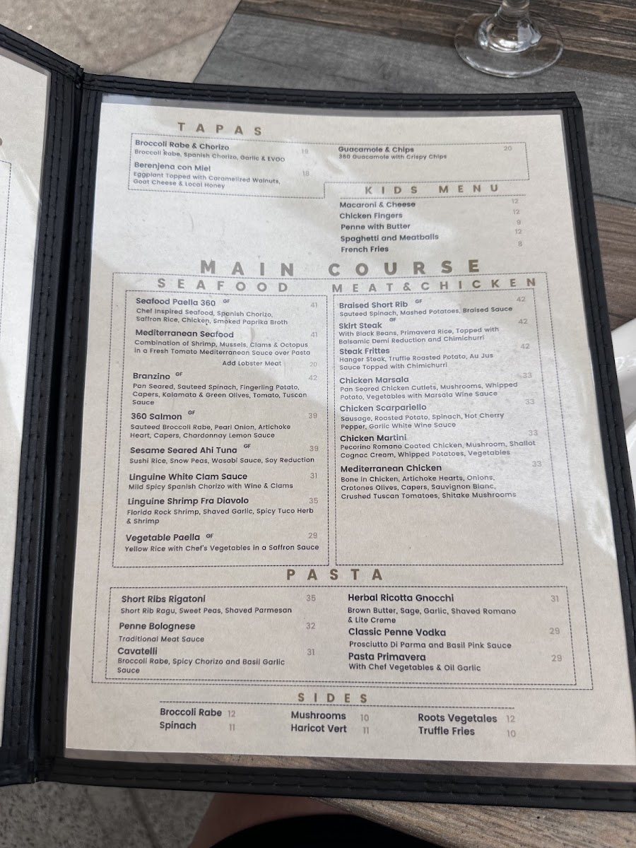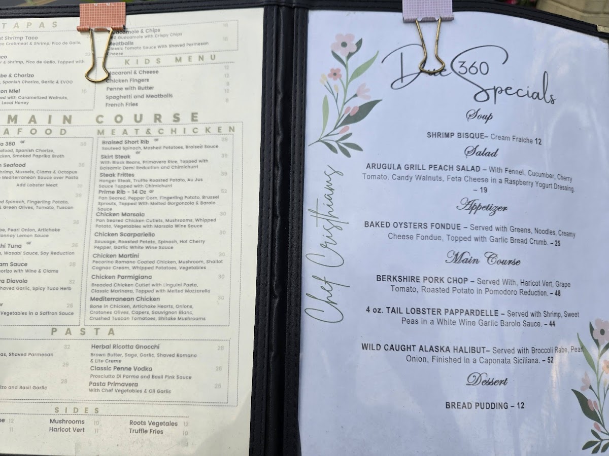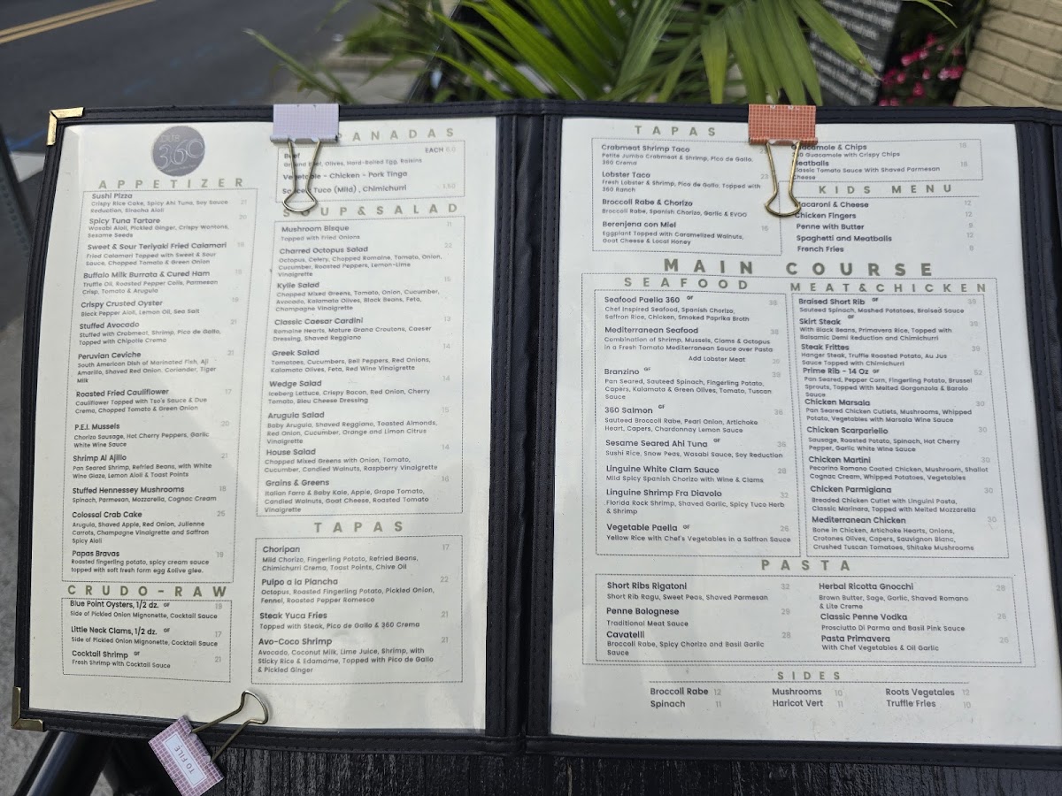 Eggplant Rollatini Stuffed With Ricotta Cheese, Spinach, Mozzarella, Marinara Sauce. 360 Brushetta Cherry Tomato, Red Onion, Mushrooms, Shaved Parmesan Cheese Touch Balsamic Reduction. Meatballs Marinara Sauce or Cognac Cream Meat Balls. FIRSTCHOISE Caesar Salad Romaine Hearts, Mature Grana Croutons, Caesar Dressing & Shaved Reggiano Arugula Salad Baby Arugula, Shaved Reggiano, Toasted Almonds, Red Onion, Cucumber, Orange and Limon Citrus Vinaigrette MAINCOURSE Chicken Scarpariello Sausage, Roasted Potato, Spinach, Hot Cherry Pepper & Garlic White Wine Sauce Cavatelli Pasta Broccoli Rabe, Spicy Chorizo and Basil Garlic Sauce. 360 Salmon Sautéed Broccoli Rabe, Pearl Onion, Artichoke Heart, Capers & Chardonnay Lemon Sauce TRIODESSERT Gelato Ice Cream Almond Biscotti Tiramisu Or Coffee, Tea, Cappuccino & Expresso