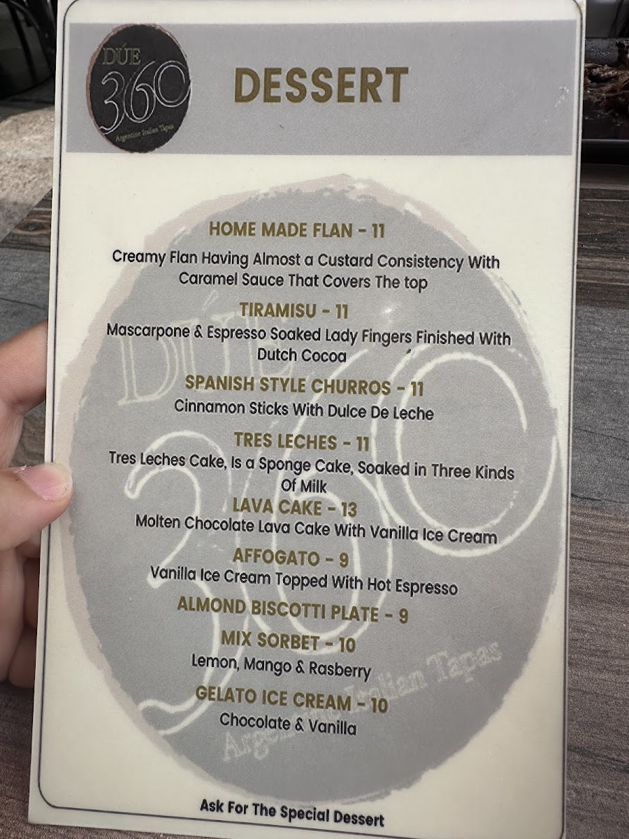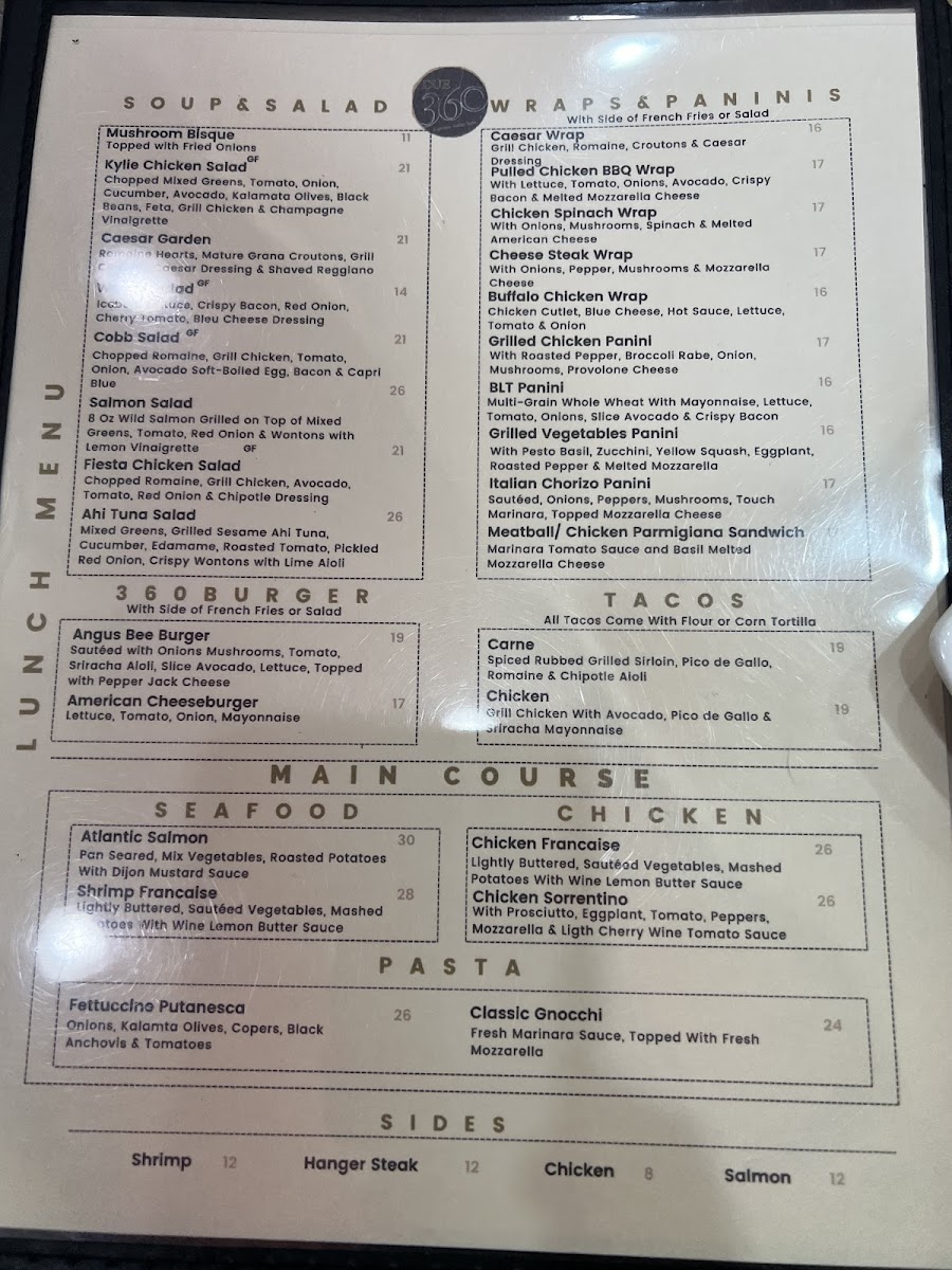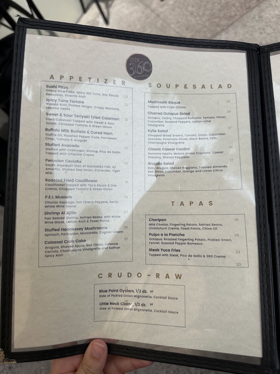 Eggplant Rollatini Stuffed With Ricotta Cheese, Spinach, Mozzarella, Marinara Sauce. 360 Brushetta Cherry Tomato, Red Onion, Mushrooms, Shaved Parmesan Cheese Touch Balsamic Reduction. Meatballs Marinara Sauce or Cognac Cream Meat Balls. FIRSTCHOISE Caesar Salad Romaine Hearts, Mature Grana Croutons, Caesar Dressing & Shaved Reggiano Arugula Salad Baby Arugula, Shaved Reggiano, Toasted Almonds, Red Onion, Cucumber, Orange and Limon Citrus Vinaigrette MAINCOURSE Chicken Scarpariello Sausage, Roasted Potato, Spinach, Hot Cherry Pepper & Garlic White Wine Sauce Cavatelli Pasta Broccoli Rabe, Spicy Chorizo and Basil Garlic Sauce. 360 Salmon Sautéed Broccoli Rabe, Pearl Onion, Artichoke Heart, Capers & Chardonnay Lemon Sauce TRIODESSERT Gelato Ice Cream Almond Biscotti Tiramisu Or Coffee, Tea, Cappuccino & Expresso