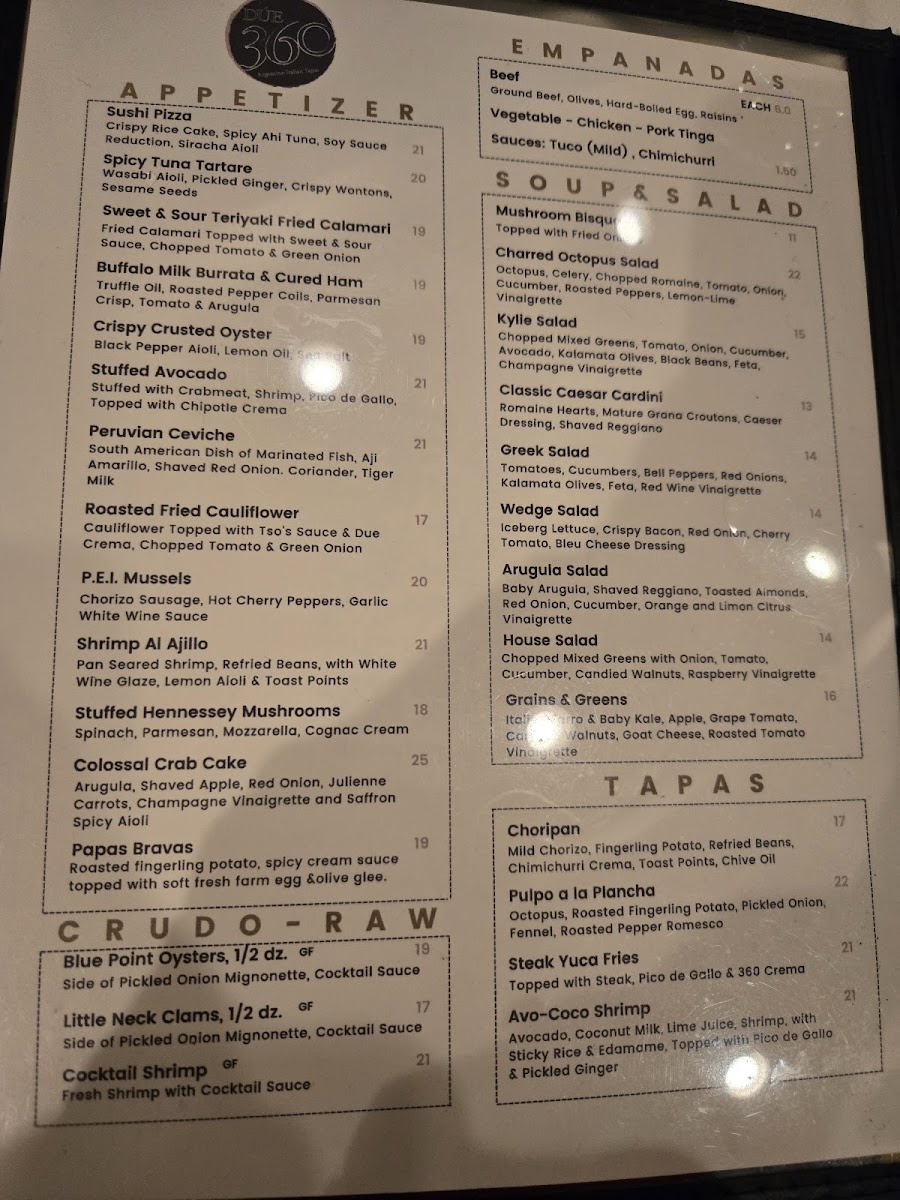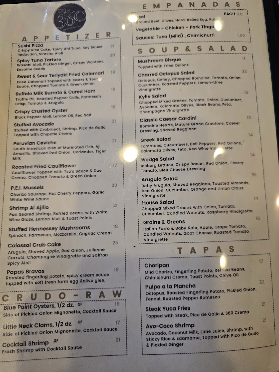 At Due 360 Menu, located at 50 Maple St, Summit, NJ, you'll discover a delightful mix of flavors and textures that will leave you coming back for more. The menu features a range of dishes, from fresh, vibrant salads to hearty, flavorful entrées. Each dish is carefully crafted with high-quality ingredients, ensuring that every bite bursts with taste. Whether you're in the mood for something light and refreshing or a rich, comforting meal, there's something here to satisfy your cravings.